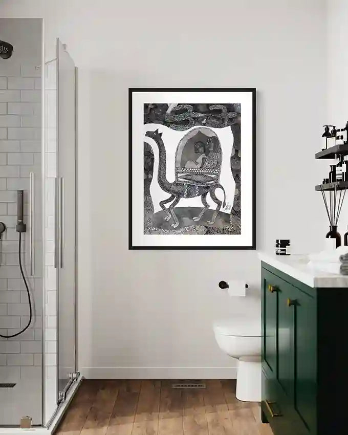 This captivating black and white illustration by Tariq Nasre depicts a tender moment between two female figures journeying on camelback through an ornate, dreamlike landscape. Intricate patterns and swirling clouds frame the composition, while detailed cross-hatching brings depth to the desert scene. The camel's decorated saddle and the women's intimate positioning suggest a sacred pilgrimage through both physical and metaphorical realms. Nasre's masterful pen work transforms a simple journey into a poetic meditation on connection and adventure.